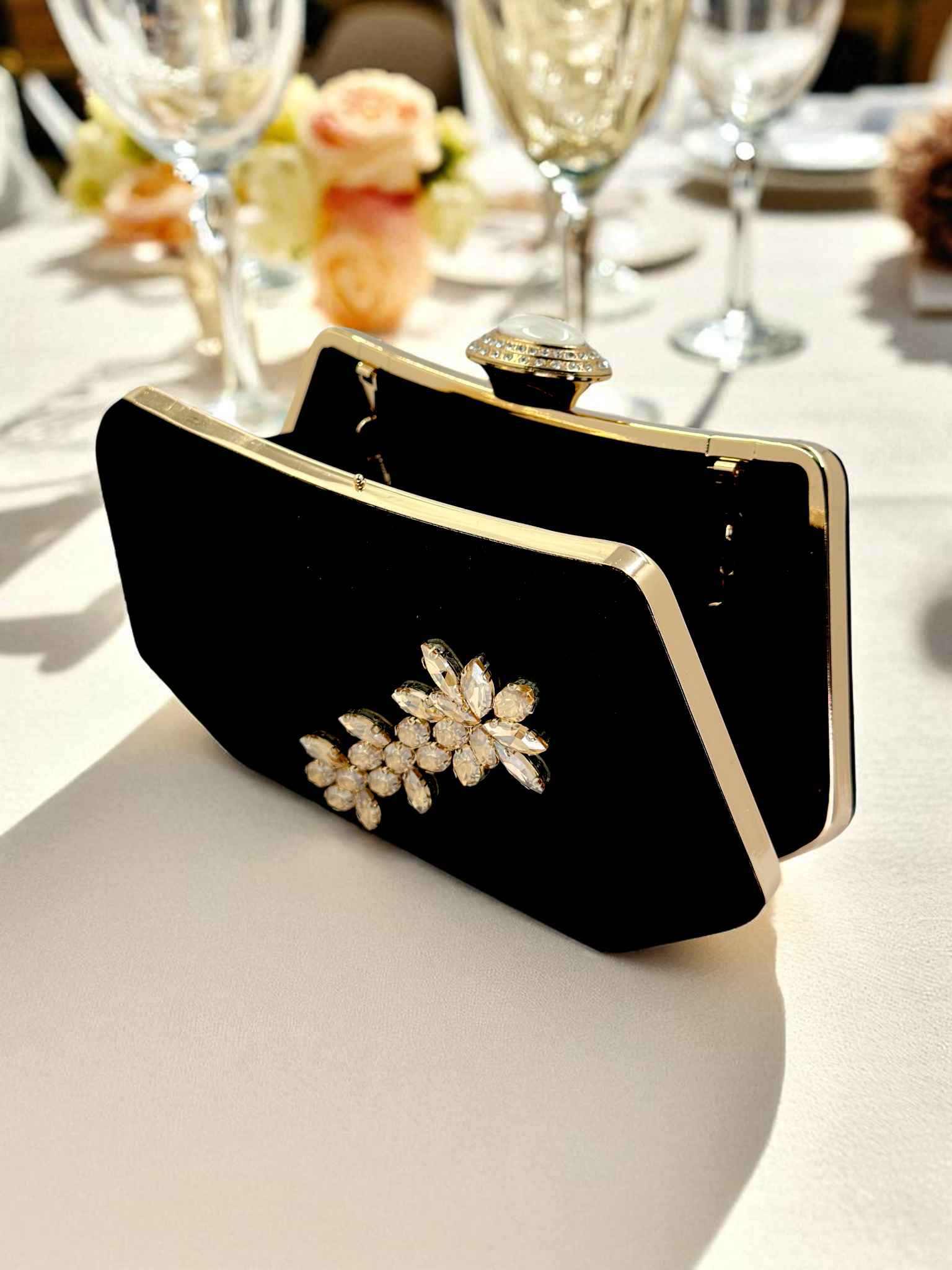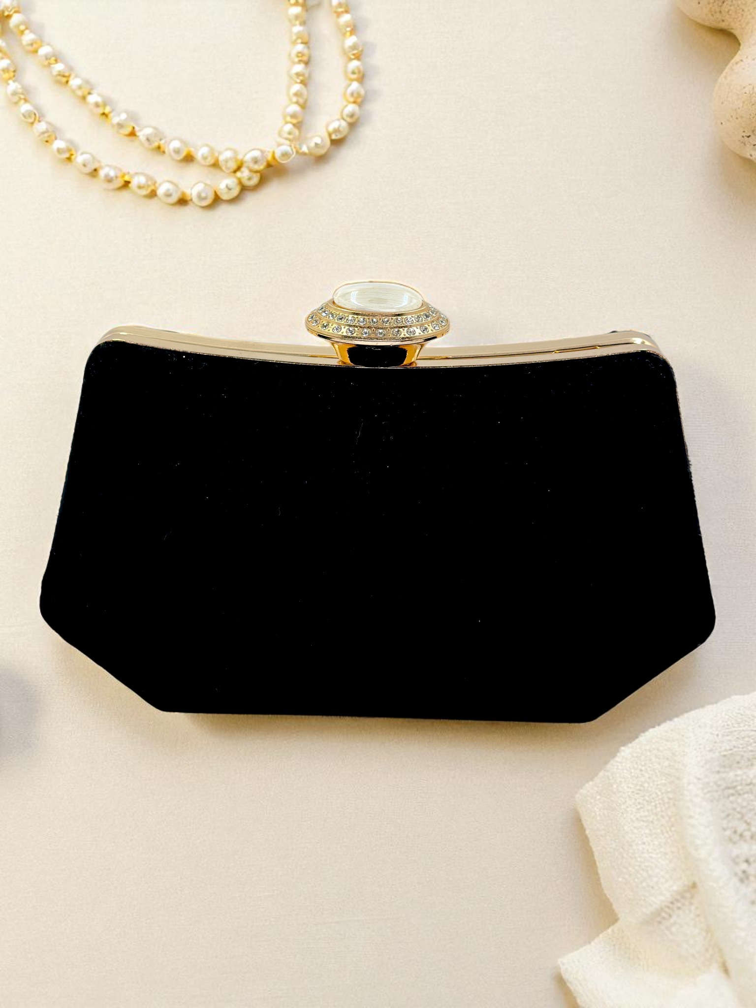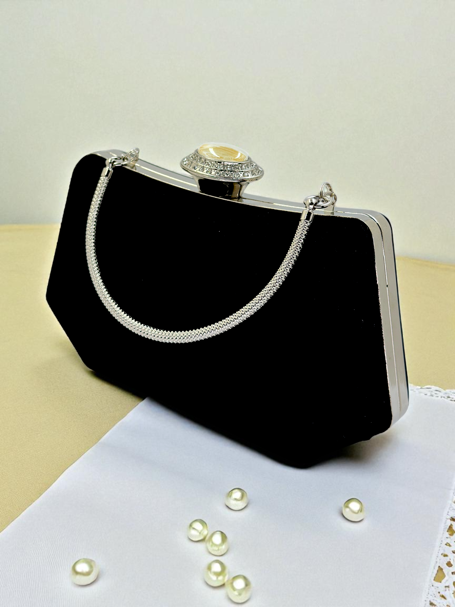 En özel anlarınızın tamamlayıcısı <b>Siyah Kristal Taşlı İnci Detaylı Abiye Çanta</b>, zarafeti ve lüksü bir araya getiriyor. Nişan, düğün, kına veya mezuniyet gibi unutulmaz geceler için tasarlanan bu eşsiz parça, aradığınız gece çantası standardını belirliyor. Süet dokusu ve zarif 20x12 cm boyutu ile sadece şık değil, aynı zamanda taşıması konforludur.