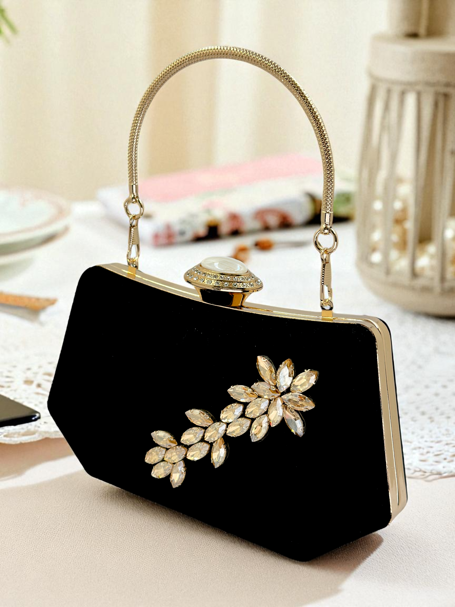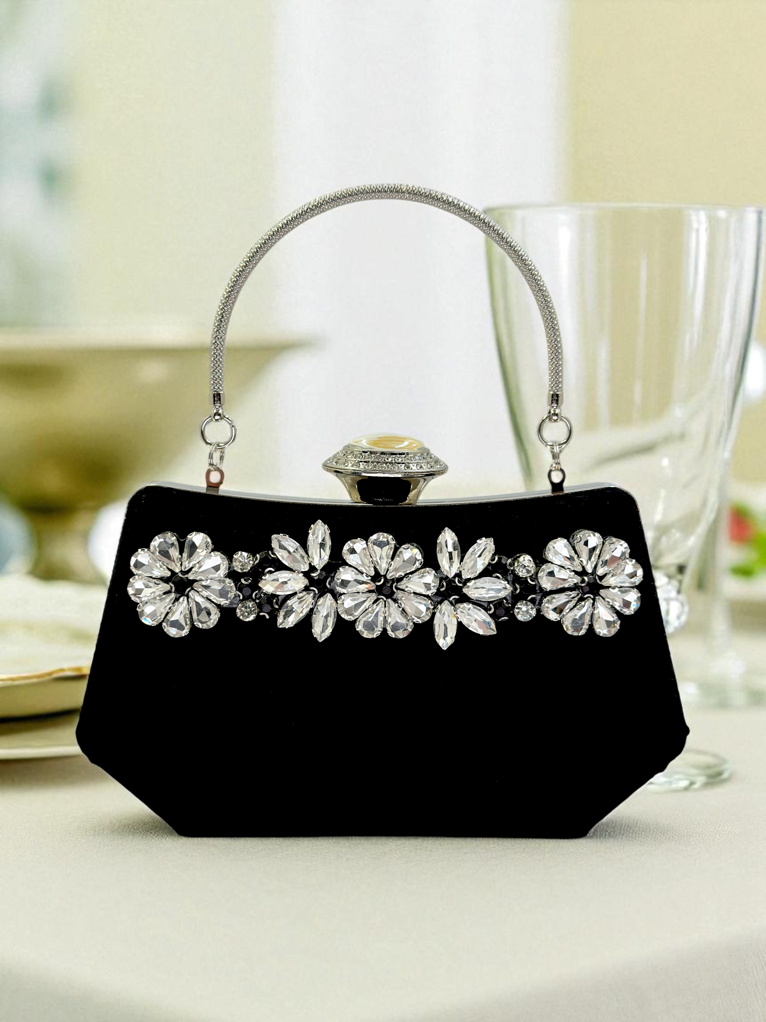 Siyah Kristal Taşlı İnci Detaylı Lüks Abiye Çanta Clutch