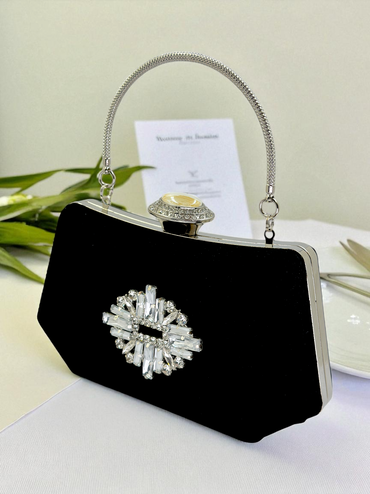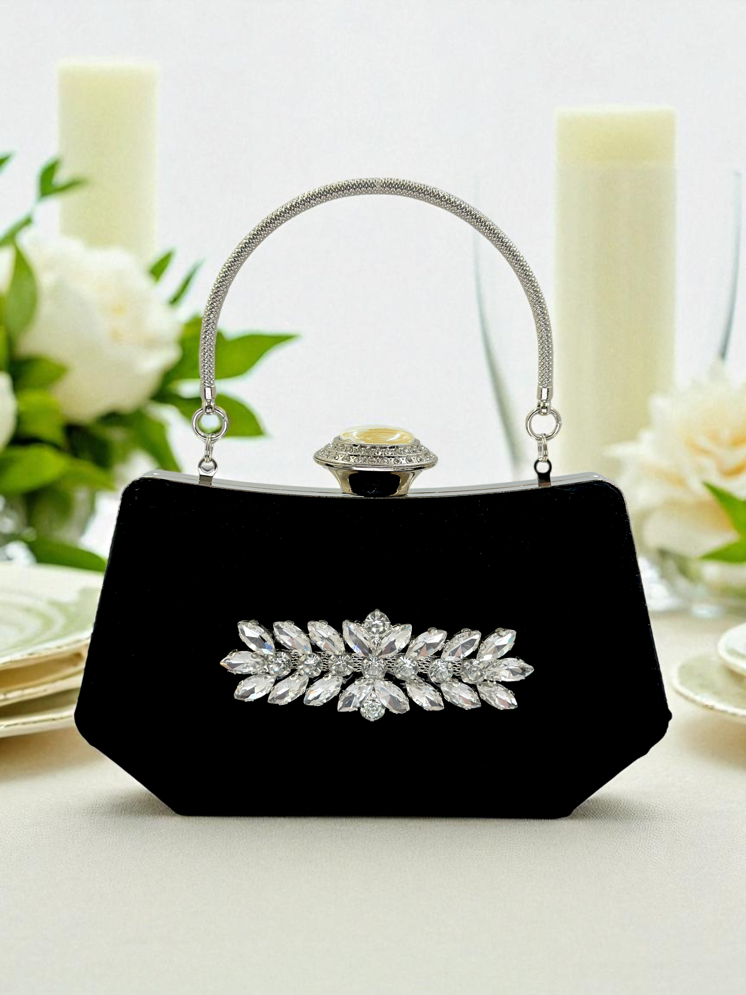 Bu <i>abiye çanta</i> modelinin en dikkat çekici özelliği, gümüş renkli metal çerçeve üzerinde titizlikle işlenmiş inci ve parlak kristal taş işlemeleridir. Işığı mükemmel yakalayan bu detaylar sayesinde, ister sade bir elbise ister iddialı bir kombin tercih edin, daima tüm gözler üzerinizde olacak. Piyasada bulunan simli abiye çanta veya rugan abiye çanta modellerine üstün bir alternatif sunan bu clutch, her hareketinizde parlar. Bu özel tasarım, sadece bir aksesuar değil, aynı zamanda yatırım parçasıdır. Geceden geceye rahatlıkla taşıyabileceğiniz bu <b>siyah taşlı el çantası</b>, telefonunuz, kartlarınız ve makyajınız için yeterli iç hacme sahiptir. İster şık bir saten clutch olarak elde taşıyın, ister zinciriyle omuzda kullanın. Hayalinizdeki düğün çantası, nişan çantası veya gelin çantası artık sadece bir tık uzağınızda.